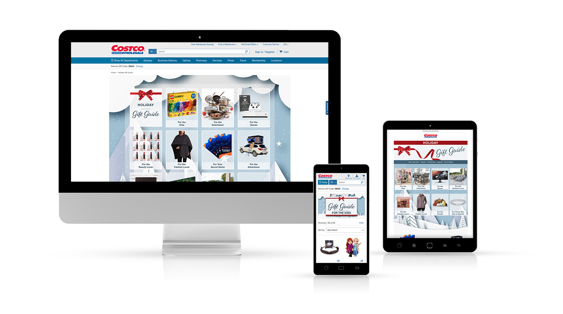 Creating a fun and joyful holiday gift guide to help customers navigate to unique items on sale, showcased in various promotions. The Costco website has mulitple campaigns simultaneously and a huge variety of product. Helping customers find what they are looking for in a specific category.