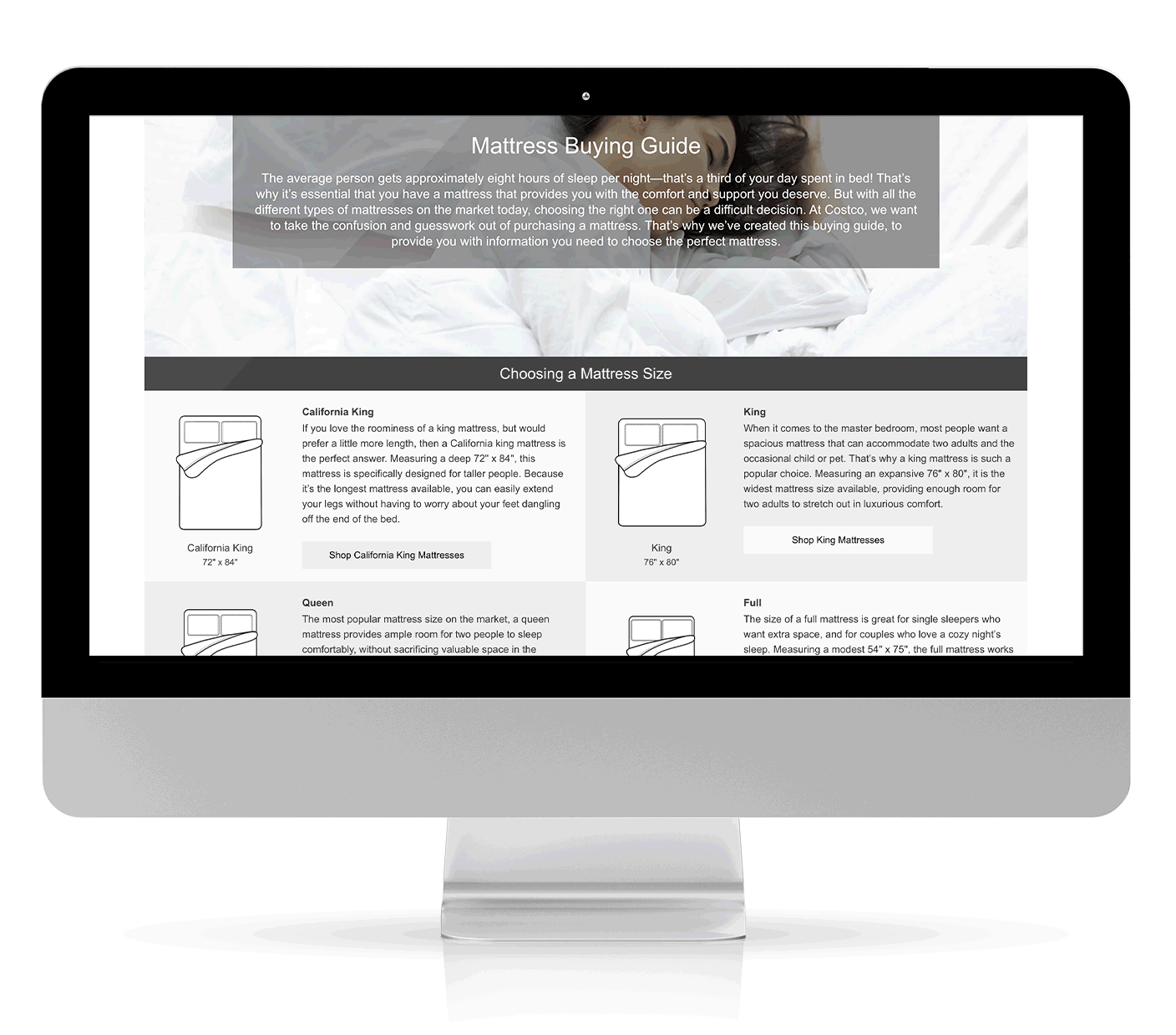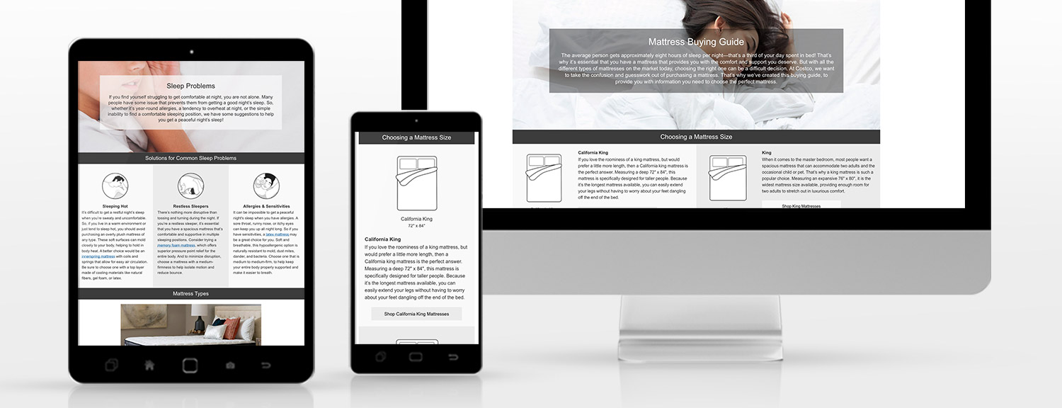 Costco needed a page to explain the different mattress types to help customers find the one mattress that would suit them best. I had complete design freedom with this page. I was able to implement my illustrations, layout the content and code the page. I was provided with the text. All the icon illustrations of the resting figures and mattress sizes, I created in Adobe Illustrator.