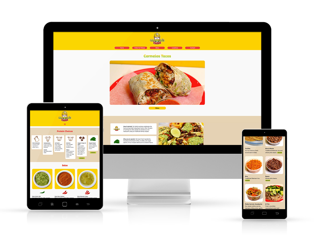 Carmelos Tacos is a well loved restaurant in the heart of Seattle. They had several locations, a loyal following and no website. As they develop an online presence the web functionality grows with it.